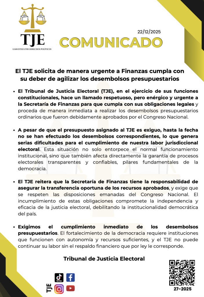 El Tribunal de Justicia Electoral (TJE) lanzó este lunes un llamado “respetuoso pero enérgico y urgente” a la Secretaría de Finanzas para que proceda de inmediato a realizar los desembolsos presupuestarios ordinarios aprobados por el Congreso Nacional, denunciando que hasta la fecha no se han efectuado, lo que genera serias dificultades para su labor jurisdiccional.