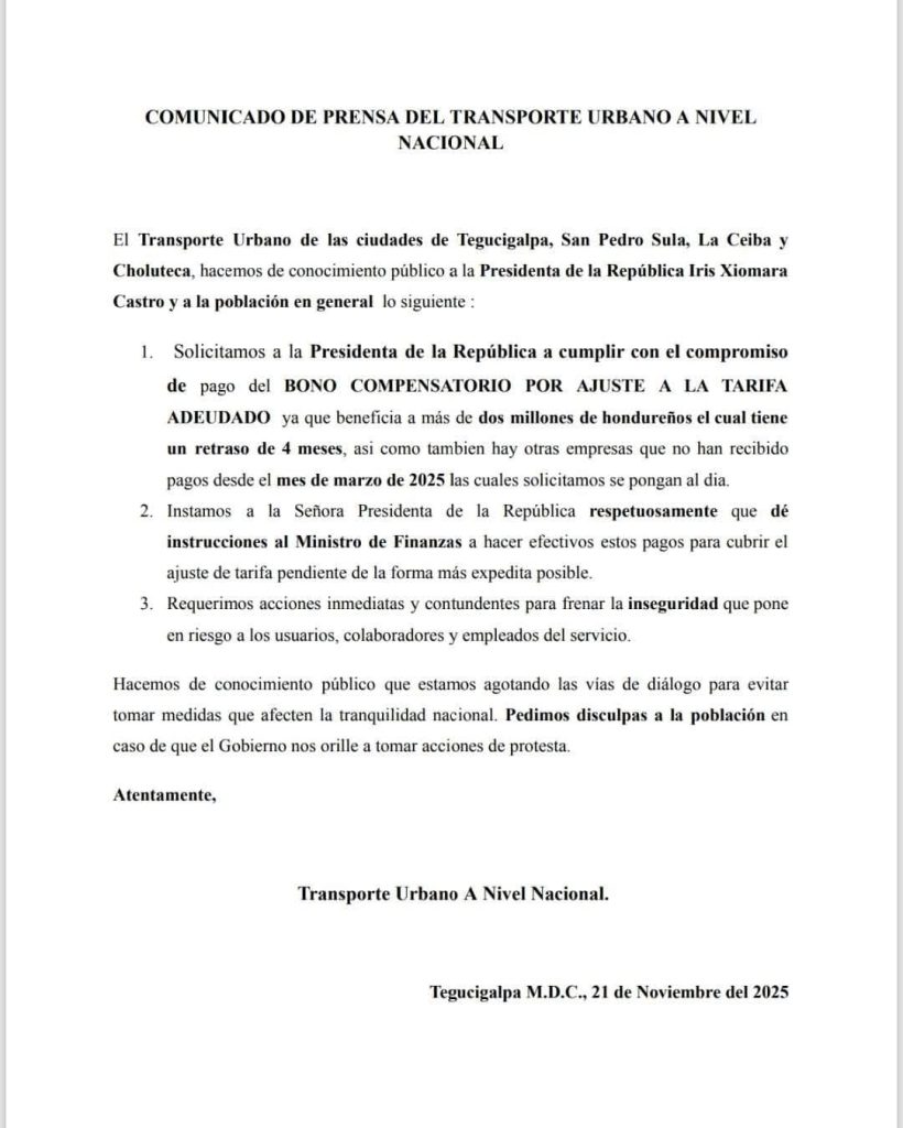 Los empresarios del transporte urbano de Tegucigalpa, San Pedro Sula, La Ceiba y Choluteca exigieron este viernes al Gobierno el desembolso inmediato del bono compensatorio por ajuste tarifario, el cual acumula un retraso de cuatro meses y afecta directamente la operatividad del servicio que beneficia a más de dos millones de usuarios diarios.