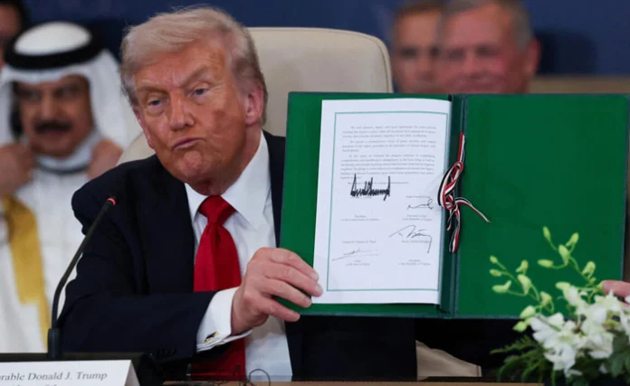 «Hemos logrado lo que todos decían que era imposible. Por fin tenemos paz en Oriente Medio», dijo el mandatario en un discurso durante una ceremonia que ha congregado a una treintena de líderes mundiales en Sharm el Sheij, en el sur de la península del Sinaí.