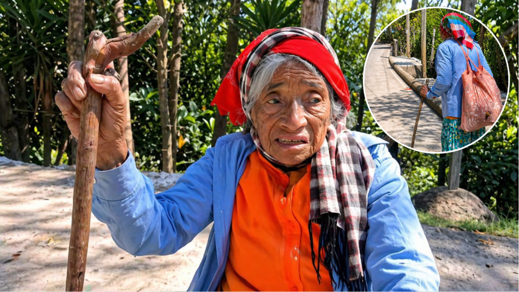 Doña Teodora Vásquez, de 98 años, recorre a pie varios kilómetros desde La Esperanza hasta la iglesia de Yamaranguila y posteriormente hacia la comunidad de El Pelón, en Intibucá, con el objetivo de encontrar alimento, enfrentando largas distancias y las limitaciones propias de su edad.