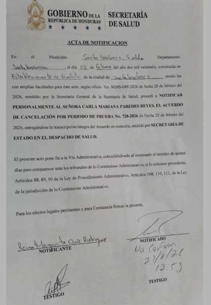 El nombramiento, realizado en septiembre de 2025 bajo el régimen de Servicio Civil, contemplaba un salario superior a los 105 mil lempiras mensuales, lo que generó malestar en el gremio de salud por posibles irregularidades. La notificación fue entregada en Gualala, Santa Bárbara, donde Paredes firmó de recibido, aunque dejó constancia de su inconformidad. Pese a que el acuerdo cierra la vía administrativa, cuenta con un plazo de 15 días para presentar un recurso ante la jurisdicción contencioso-administrativa.