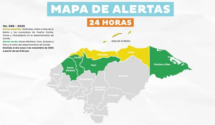 Asimismo, emitió Alerta Verde para los departamentos de Santa Bárbara, Yoro, Gracias a Dios y el resto del departamento de Cortés.