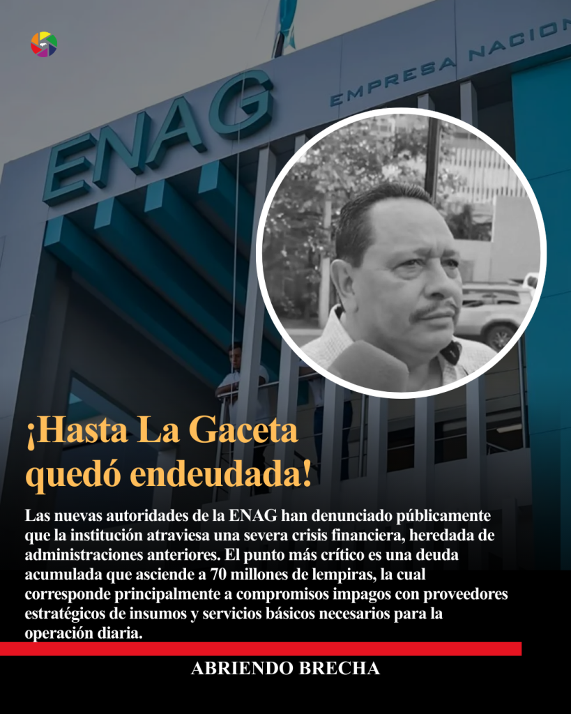 Las nuevas autoridades de la ENAG han denunciado públicamente que la institución atraviesa una severa crisis financiera, heredada de administraciones anteriores. El punto más crítico es una deuda acumulada que asciende a 70 millones de lempiras, la cual corresponde principalmente a compromisos impagos con proveedores estratégicos de insumos y servicios básicos necesarios para la operación diaria.