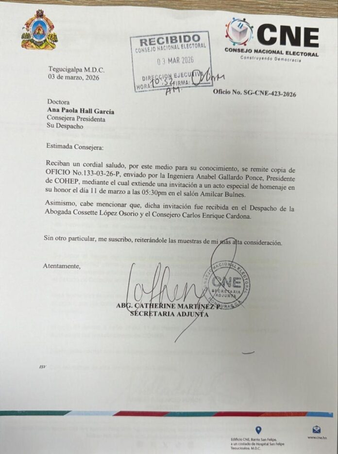 La presidenta del Consejo Hondureño de la Empresa Privada (Cohep), Anabel Gallardo Ponce, ha enviado una invitación formal a la consejera presidenta del Consejo Nacional Electoral (CNE), Ana Paola Hall, para un acto especial en su honor.