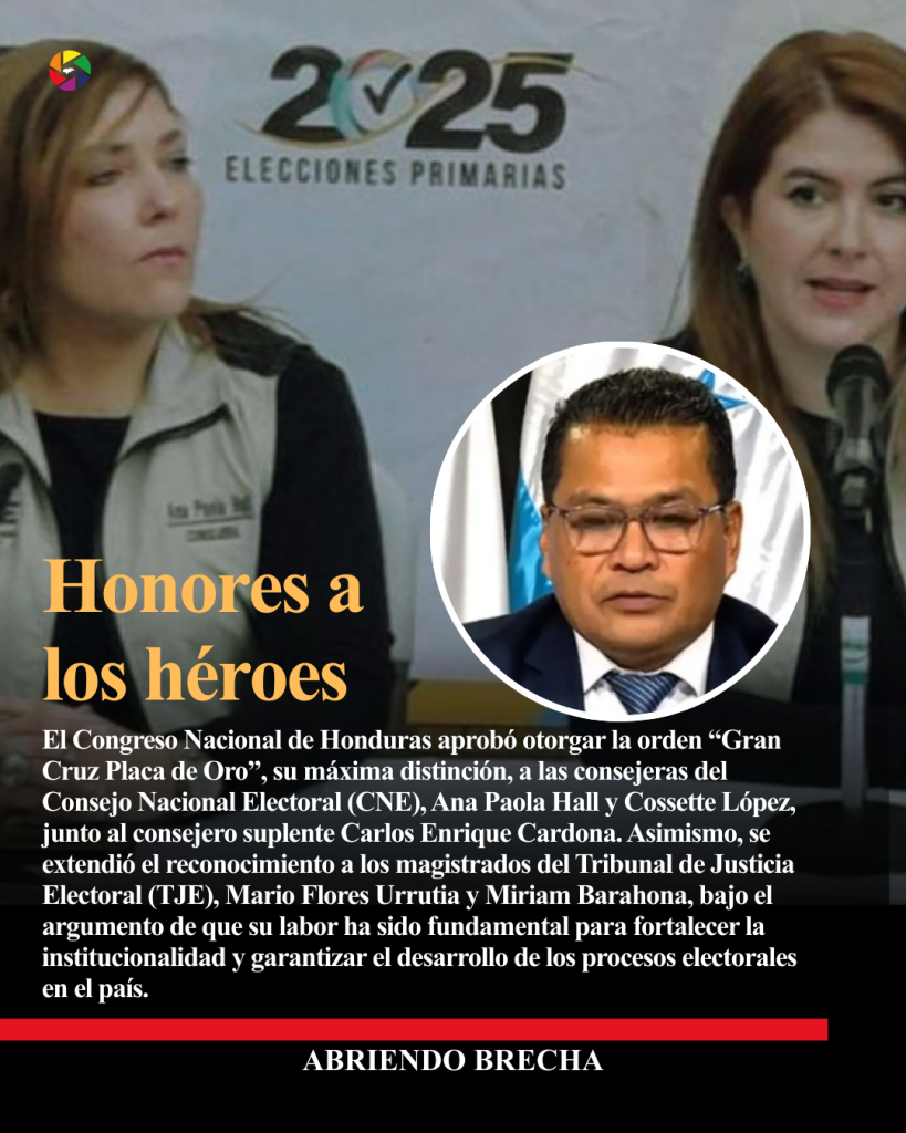 El Congreso Nacional de Honduras aprobó otorgar la orden “Gran Cruz Placa de Oro”, su máxima distinción, a las consejeras del Consejo Nacional Electoral (CNE), Ana Paola Hall y Cossette López, junto al consejero suplente Carlos Enrique Cardona. Asimismo, se extendió el reconocimiento a los magistrados del Tribunal de Justicia Electoral (TJE), Mario Flores Urrutia y Miriam Barahona, bajo el argumento de que su labor ha sido fundamental para fortalecer la institucionalidad y garantizar el desarrollo de los procesos electorales en el país.