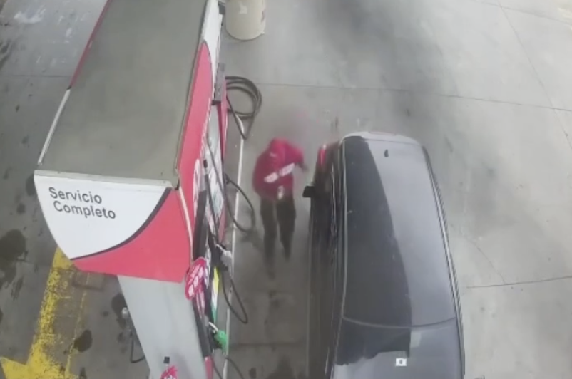 Las imágenes del incidente muestran cómo el trabajador, confiado, interactúa con el conductor y espera pacientemente mientras el tanque se llena por completo, sin sospechar que el hombre se marcharía sin pagar.
