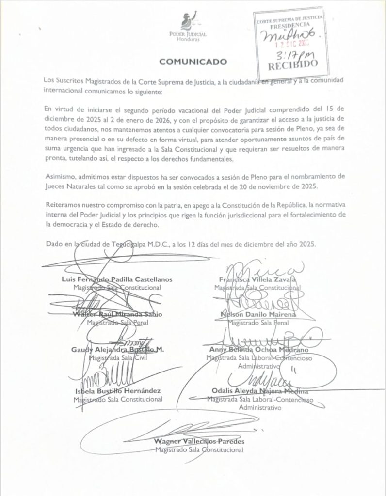 Nueve magistrados de la Corte Suprema de Justicia (CSJ) emitieron este jueves un comunicado en el que aseguran que, pese al segundo período vacacional del Poder Judicial del 15 de diciembre de 2025 al 2 de enero de 2026, permanecerán atentos a cualquier convocatoria para sesión de Pleno —presencial o virtual— con el fin de resolver “asuntos de país de suma urgencia” ingresados a la Sala de lo Constitucional que requieran atención inmediata para tutelar derechos fundamentales.