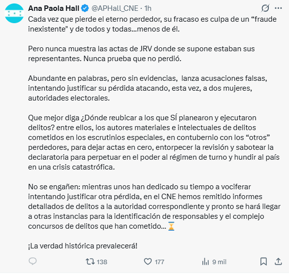 La consejera del Consejo Nacional Electoral (CNE), Ana Paola Hall, se refirió a las constantes denuncias de supuesto fraude electoral emitidas por un sector político de oposición, al que sin mencionar directamente calificó como un “eterno perdedor”.