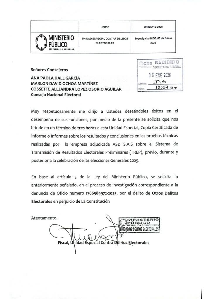 El Ministerio Público emplazó al pleno del Consejo Nacional Electoral (CNE) para que remita, en un plazo de tres horas, copias de los informes electorales relacionados con los resultados y conclusiones de las pruebas técnicas realizadas por la empresa Grupo ASD.