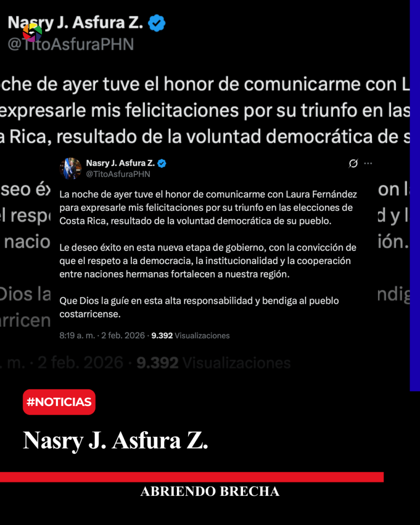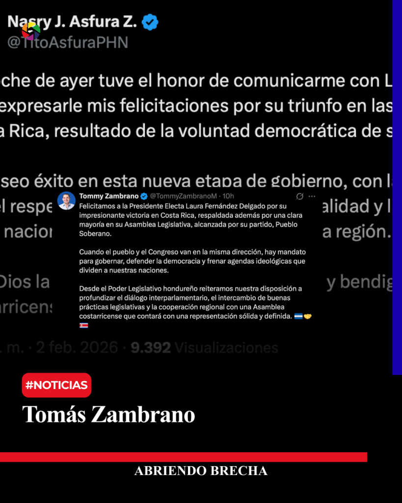 El presidente constitucional y el presidente del Congreso Nacional de Honduras han ofrecido sus cálidas felicitaciones a la presidenta electa de Costa Rica, Laura Fernández, destacando que: “Cuando el pueblo y el Congreso van en la misma dirección, hay mandato para gobernar, defender la democracia y frenar agendas ideológicas que dividen a nuestras naciones”, según lo mencionó el presidente del Congreso Nacional, Tomás Zambrano.