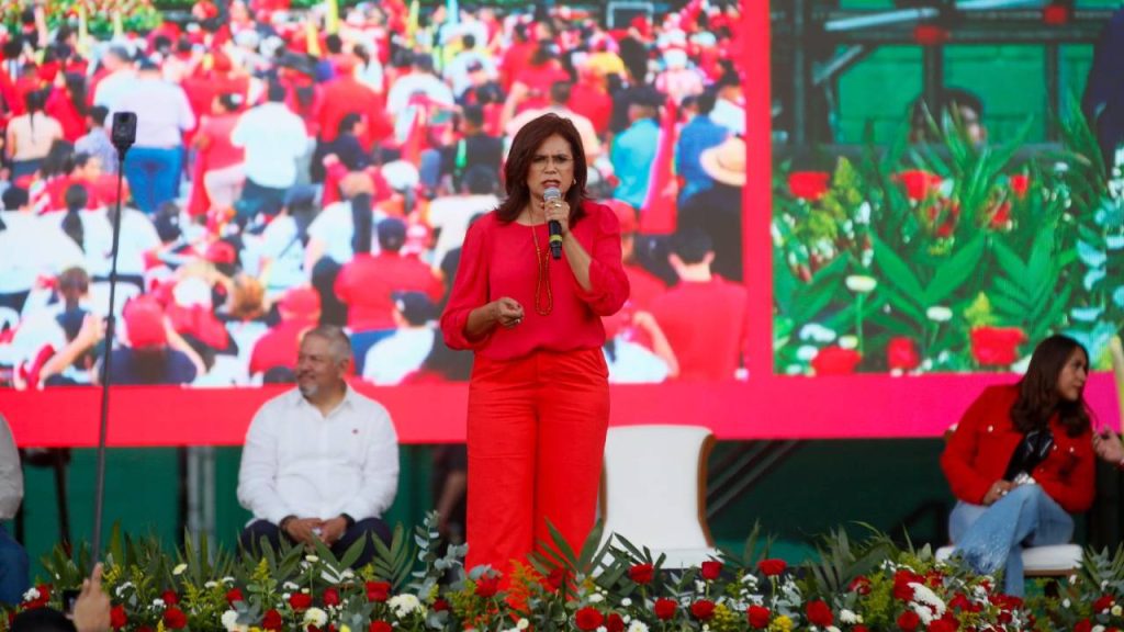 La candidata del partido Libertad y Refundación, Rixi Moncada, quien resultó en tercer lugar de las elecciones generales con apenas un poco más de 600 mil votos (19 %), durante un mitin político esta tarde en casa presidencial hasta donde llegaron decenas de simpatizantes de Libre.