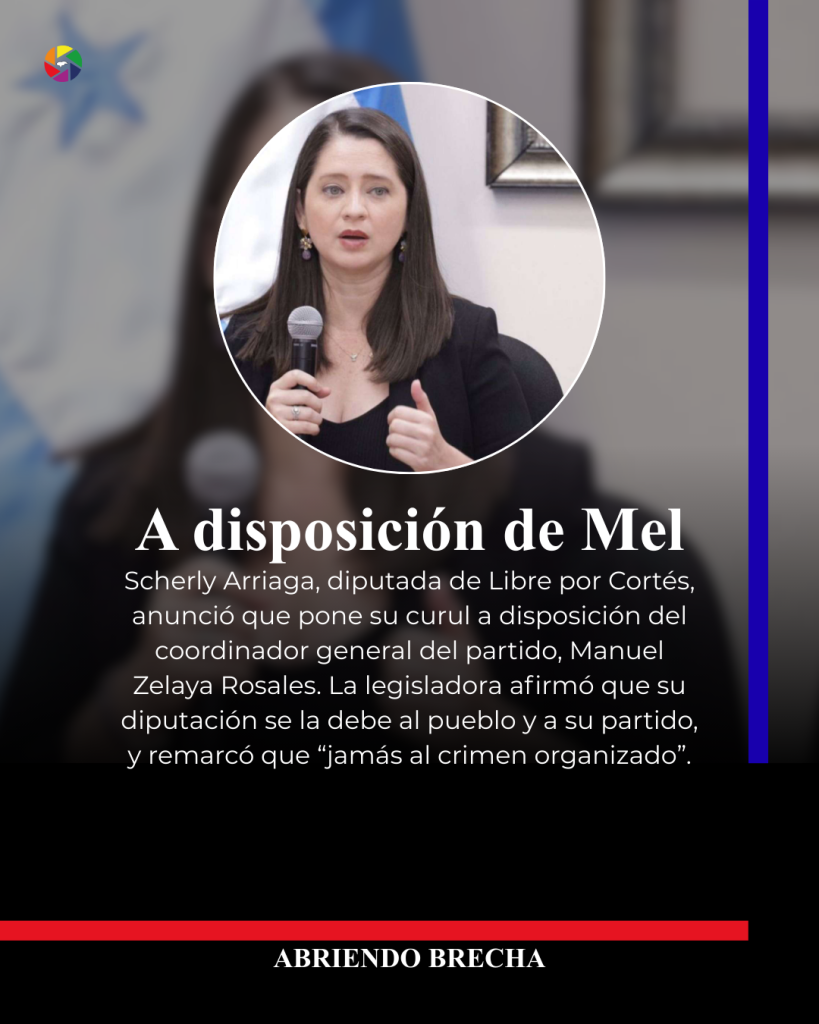 Scherly Arriaga, diputada de Libre por Cortés, anunció que pone su curul a disposición del coordinador general del partido, Manuel “Mel” Zelaya. La legisladora destacó que su cargo se lo debe al pueblo y a su partido, y no a intereses externos.