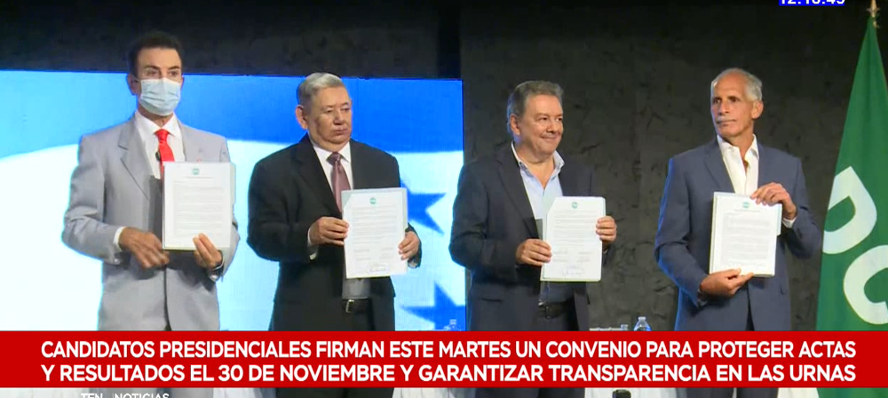 Tres de los cinco candidatos a la presidencia de Honduras firmaron este martes un convenio democrático para cuidar el voto en las Juntas Receptoras de Votos (JRV) durante las elecciones generales del 30 de noviembre.